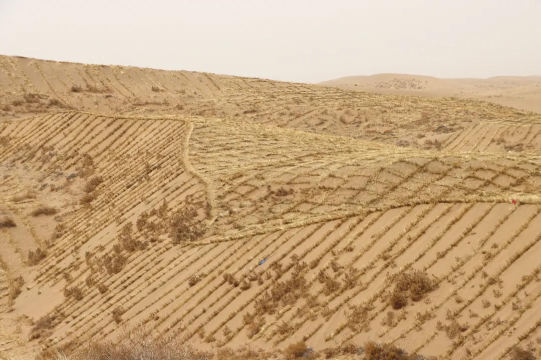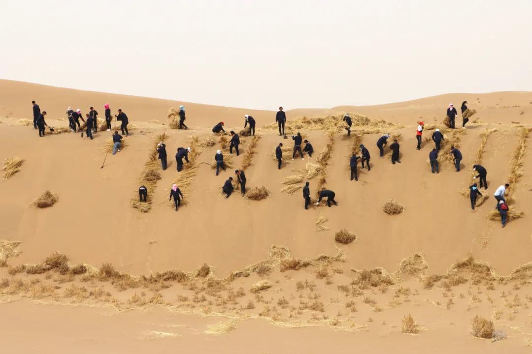 經(jīng)過了一整天的辛苦勞作,可謂戰(zhàn)果滿滿, 整齊劃一的“草方格”, 從大家的腳底下延伸至遠(yuǎn)方,像一道道迷人的風(fēng)景。無數(shù)的“草方格”,形成了成片沙障,將在這廣袤的沙海中,與風(fēng)沙牢牢抗衡。