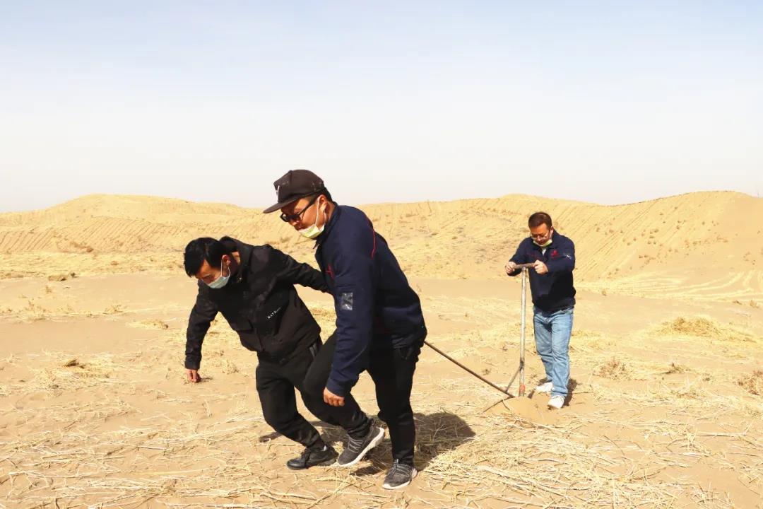 “壓沙前,先要在沙丘上按設(shè)置方向、間距或網(wǎng)格劃好設(shè)置線。背風(fēng)坡,壓豎道;迎風(fēng)坡,就要橫豎格子全壓。先開寬25厘米、深20厘米的沙溝,將稻草在沙溝上均勻無間斷鋪好,再將沙子壓實在稻草中間,將兩邊翹起的稻草用沙淤起與沙面垂直,扶成“雙眉式”……大家仔細(xì)聆聽了區(qū)林草局技術(shù)人員的詳細(xì)講解和指導(dǎo)后,很快掌握了規(guī)范的壓沙方法和要求,各小組迅速投入到熱火朝天的防沙壓沙活動中。