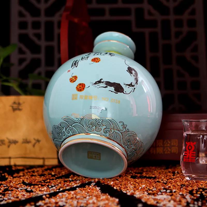 皇臺(tái)·鼠年生肖酒,瓶身為帝王壇瓶型?;宜{(lán)色系,寧?kù)o高遠(yuǎn)。細(xì)膩圓潤(rùn)的瓶身上,燙金字體,襯得瓶身愈發(fā)高端典雅;兩只小老鼠,拙樸可愛(ài),姿態(tài)不一,意趣盎然?;逝_(tái)·鼠年生肖酒,巧秒地將生肖文化和酒文化完美地融合在了一起,在高端閑適之間,讓人感受到一絲輕松、愉悅和寧?kù)o的氣息。真可謂壺中日月,酒中春秋!