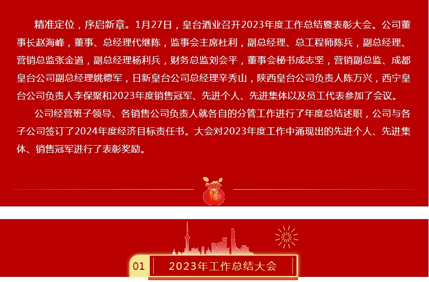 一元復(fù)始,萬象更新。過去的一年,皇臺(tái)人攜手并進(jìn),共同書寫了公司發(fā)展的新篇章,我們看到了一個(gè)充滿活力的新皇臺(tái),正蓬勃而來。成績(jī)屬于過去,新的一年,機(jī)遇和挑戰(zhàn)并存,市場(chǎng)競(jìng)爭(zhēng)依然激烈,需要我們以更昂揚(yáng)的精神面貌,迎接新挑戰(zhàn),以高度的使命感和責(zé)任感來推進(jìn)公司可持續(xù)發(fā)展。展望未來,我們信心滿懷,讓我們以更加堅(jiān)定的決心,更加開放的心態(tài),更加積極的態(tài)度,去面對(duì)工作中的每一個(gè)挑戰(zhàn),追求我們的目標(biāo),創(chuàng)造新的輝煌業(yè)績(jī)!
