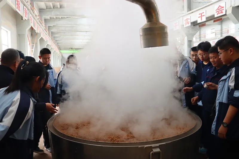 在公司廠史室,大家通過豐富的圖文和講解,了解了皇臺酒業(yè)的歷史沿革、發(fā)展歷程以及涼州酒的淵源流長;在生產(chǎn)車間,師生們近距離觀察了原料篩選、釀造、發(fā)酵到蒸餾等整個釀酒工藝過程,同學(xué)們充分結(jié)合生物學(xué)課本的發(fā)酵章節(jié),認(rèn)真聆聽,對課本上的“發(fā)酵工程及其應(yīng)用”有了更直觀的認(rèn)識,和更深刻的理解;在半成品酒庫,他們看到了蔚然壯觀的儲酒容器和酒海子。