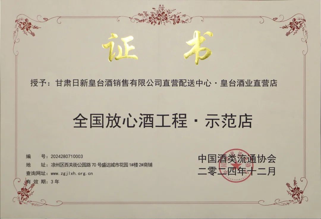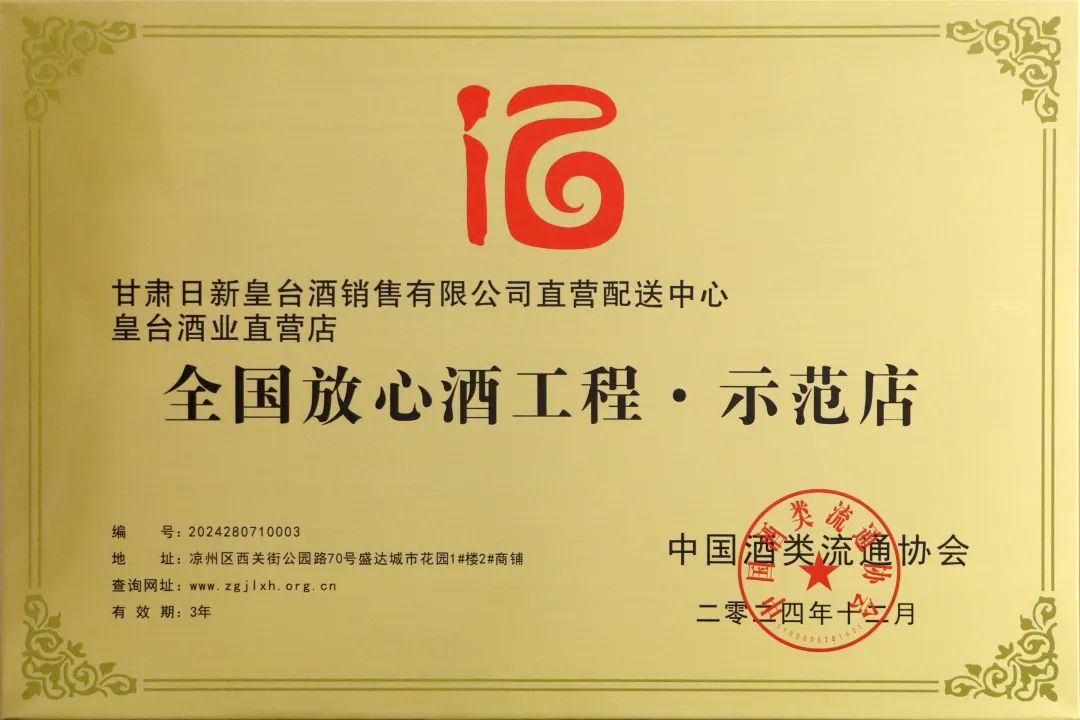 12月中旬,2024年中國酒類流通協(xié)會公布了全國放心酒工程示范企業(yè)(店)名單,甘肅皇臺酒業(yè)股份有限公司憑借優(yōu)異的品質(zhì)和信譽,成功榮獲了全國放心酒工程·示范企業(yè)殊榮。與此同時,甘肅日新皇臺酒銷售有限公司直營配送中心也因其優(yōu)質(zhì)的服務和管理,榮獲了全國放心酒工程·示范店稱號。