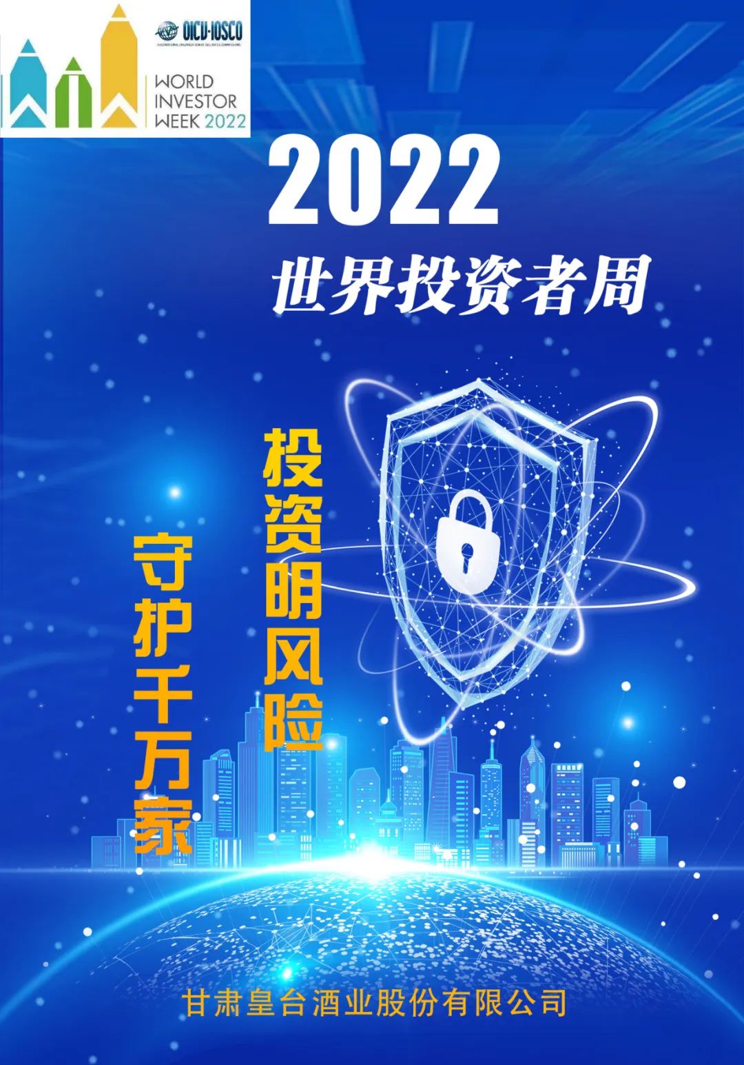 2022年10月8日-14日為“2022年世界投資者周”,本次活動主題為“投資明風(fēng)險,守護千萬家”。為貫徹落實監(jiān)管部門投資者保護工作的部署要求,加強投資者教育保護的國際交流合作,積極響應(yīng)“2022年世界投資者周”活動號召,皇臺酒業(yè)在監(jiān)管部門的指導(dǎo)下,將以“投資明風(fēng)險,守護千萬家”為主題,開展投資者教育和保護宣傳,面向投資者做好證券基金期貨知識宣傳普及,引導(dǎo)投資者學(xué)習(xí)金融知識,樹立正確投資理念!