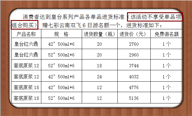 各位親,不論您是婚宴喜事,還是喬遷新居;不論是商超進(jìn)貨,還是好酒收藏……只要您進(jìn)購以下同等價(jià)值的皇臺美酒,即可獲得一場說走就走的七彩云南雙飛6日游的美好之旅。
