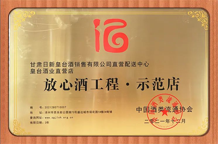 皇臺(tái)酒業(yè)直營(yíng)店被中國(guó)酒類流通協(xié)會(huì)授予