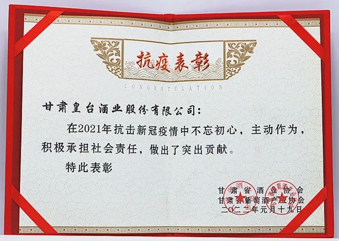 2022年1月25日,為迎接新的奮斗征程、激發(fā)新的發(fā)展動(dòng)力,搭建好交流學(xué)習(xí)、互通有無(wú)、資源對(duì)接的服務(wù)平臺(tái),更好地推動(dòng)全省酒類行業(yè)的健康有序發(fā)展,甘肅省酒業(yè)協(xié)會(huì)舉辦“迎新春聯(lián)誼會(huì)暨表彰大會(huì)”。大會(huì)上,甘肅皇臺(tái)酒業(yè)股份有限公司被中國(guó)酒類流通協(xié)會(huì)授予2021年中國(guó)酒類流通協(xié)會(huì)放心酒工程示范企業(yè),甘肅日新皇臺(tái)酒銷售有限公司直營(yíng)配送中心·皇臺(tái)酒業(yè)直營(yíng)店被授予2021年中國(guó)酒類流通協(xié)會(huì)放心酒工程示范店。公司董事、總經(jīng)理代繼陳代表公司上臺(tái)領(lǐng)獎(jiǎng)。