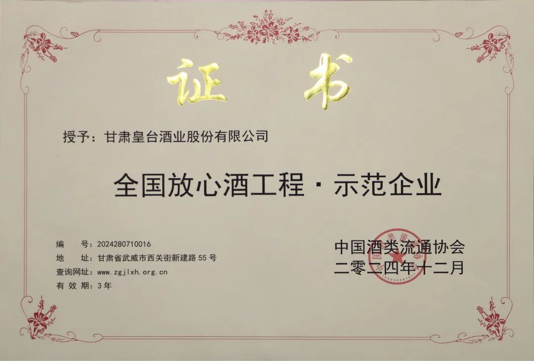 12月中旬,2024年中國酒類流通協(xié)會公布了全國放心酒工程示范企業(yè)(店)名單,甘肅皇臺酒業(yè)股份有限公司憑借優(yōu)異的品質(zhì)和信譽,成功榮獲了全國放心酒工程·示范企業(yè)殊榮。與此同時,甘肅日新皇臺酒銷售有限公司直營配送中心也因其優(yōu)質(zhì)的服務(wù)和管理,榮獲了全國放心酒工程·示范店稱號。